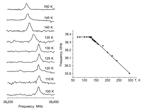 The phase transition in CNK was detected on the basis of NQR measurements. NQR was successfully used in the research of compounds with intermolecular [23] and intramolecular hydrogen bonds [24]. NQR studies revealed that the 35 Cl signal shifted to high frequencies (from 35.85 to 36.5 MHz) when the temperature fell from 300 to 120 K (the temperature of phase transition), whereas the signal was quite stable at temperatures below the transition state (Figure 3). A similar trend was observed for 1,3-diazinium hydrogen chloranilate monohydrate [25], morpholinium hydrogen chloranilate [26] and p-dichlorobenzene [27].