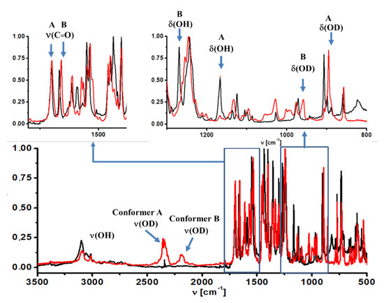 Matrix isolation IR spectra (in Ar) of 5-chloro-3-nitro-2-hyroxyacetophenone (black line) and its deuterated derivative (red line).