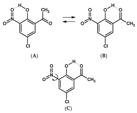 Schemes of intramolecular hydrogen bonding isomerization (A,B) and nitro group rotation (C) for 5-chloro-3-nitro-2-hydroxyacetophenone (CNK).