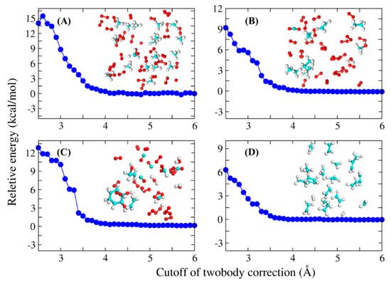 Relative potential energies (in kcal/mol) calculated by the FB-AIMD method are shown as a function of the distance threshold of two-body interaction for four different simulation systems, and the structures of these four systems were inserted in the figure. (A) random snapshot taken from the methane combustion system. (B) random snapshot taken from the ethane combustion system. (C) random snapshot taken from the cyclooctane combustion system. (D) random snapshot taken from the dodecane pyrolysis system. Potential energies calculated by the full-system QM methods are taken as reference. All QM calculations were performed at the MN15/6-31G(d) level.