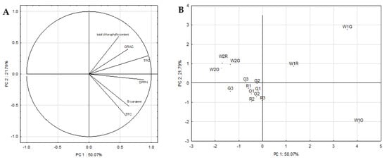 Principal components plot, variations in the parameters (TPC, TFC, DPPH, ORAC, total chlorophylls content and β-carotene) of the analyzed fruit and vegetable whey beverages and fruit and vegetable mousses (A) score plot of the analyzed fruit and vegetable whey beverages and fruit and vegetable mousses (B). Explanations: W1O, W1R, W1G—homemade fruit and vegetable whey beverages; W2O, W2R, W2G—market fruit and vegetable whey beverages; O1, O2, O3—orange mousses; R1, R2, R3—red mousses, G1, G2, G3—green mousses.