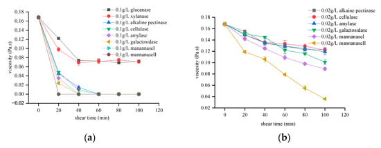 Temperature tolerance and shearing resistance of the fracturing fluid after the addition of different enzyme breakers at a shear rate of 170 sࢤ1 and at 158 °F. (a) Comparison of the temperature and shearing resistance performance of the fracturing fluid after the addition of the selected enzymes and (b) comparison of the temperature and shearing resistance performance of the fracturing fluid after the addition of the preferred enzymes at low concentrations.