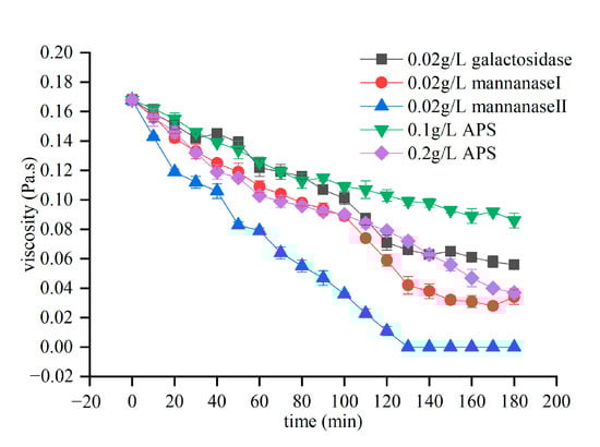 Based on the temperature and shear resistances of the fracturing fluids, as well as the sand-suspending performance after the addition of the different enzyme breaker [39], the relatively suitable mannanase I, mannanase II, and galactosidase breakers were selected for further experiments. First, the gels were prepared as per the procedure outlined in the previous section [42]. Once set up 3 groups of parallel experiments to conduct the assay, mannanase I, mannanase II, and galactosidase were added separately to a 500-mL mixture of fracturing fluid (0.02 g enzyme breaker per liter) [43,44]. Finally, the change in the viscosity of the guar polymer was measured using a rotary viscometer to study the gel-breaking efficiencies of the different enzymes. The optimal gel breaker based on the breaking efficiency/performance under simulated the reservoir conditions (158 °F, pH = 8.5) of the Xinjiang Shengli Oilfield was selected. We simultaneously conducted comparative experiments to determine the breaking efficiency of the ammonium persulfate breaker.