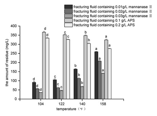 The effectiveness of the breaker can not only be characterized by viscosity of fracturing fluid, but also by the residual amount and particle size of polymer. The residual amount of polymer includes unbroken polymer and residues generated after the gel is broken. The presence of residue can cause flow reduction via the plugging of the formed fracture. Thus, a decrease in the amount of the residue corresponds to both decreased formation damage and increased production. In summary, the amount of residue is an important factor to consider in hydraulic fracturing. To evaluate the amount of residue generated by the breakers, residue-after-break experiments were conducted at 158 °F and other wider temperature range (Figure 4). The amount of residue generated by adding smaller concentrations of mannanase II was also <600 mg/L, which conforms to the criterion for evaluating the performance of water-based fracturing fluids [28,47]. Moreover, we observed that upon adding higher oxidizer concentrations (0.1 g/L) at the higher temperature of 158 °F, the mannanase II breaker still produced less residue than ammonium persulfate (Figure 4).