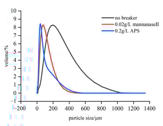 Compared with the oxidative breaker, the mannanase II induces more exhaustive and homogeneous breakage under the reservoir conditions [11,19]. To further verify this result, the experiment for the change in the molecular size of the guar during the gel-breaking process was carried out via a laser particle size analyzer at alkaline (pH = 8.5) and medium temperature (158 °F) conditions. Based on Figure 5, the molecular diameter of the fracturing fluid without the breaker is concentrated around 197.99 μm, while the molecular diameter after gel breaking with the mannanase II breaker is 42.7922 μm. The molecular diameter after gel breaking with a higher concentration of ammonium persulfate in the control group was 71.3062 μm. The experiment results showed that, compared with the use of ammonium persulfate breaker, there is a significant reduction in the size of the fracturing fluid after adding the enzyme breaker. Guar polymer molecules with this size can easily flow through the porous medium and improve reservoir conductivity [24].