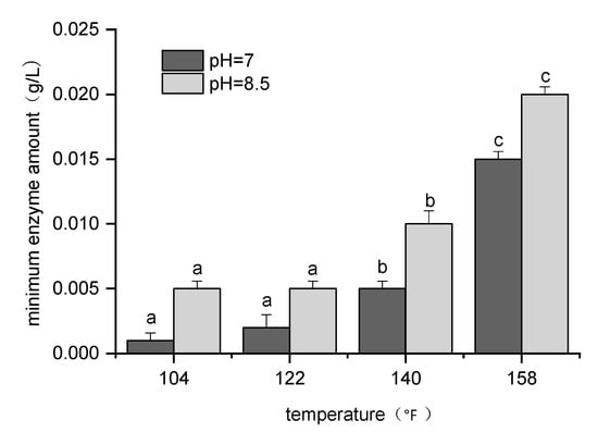 Plot of the minimum enzyme amount required to break the gel under different temperature and pH conditions (for each group of bars, the different letters indicate the means that are significantly different at p < 0.05, where the vertical bars represent ± SD (n = 3)).