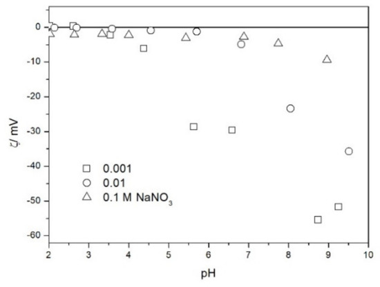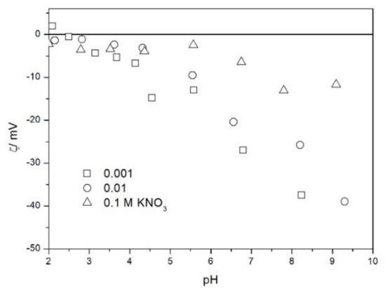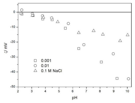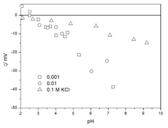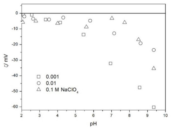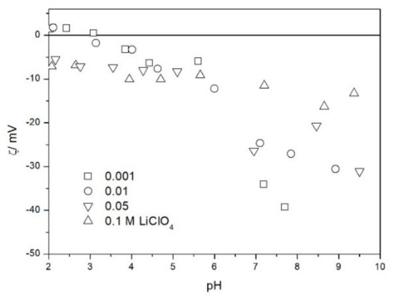 The zeta potential of TeO2 in various 1-1 electrolytes is shown in Figure 2, Figure 3, Figure 4, Figure 5, Figure 6 and Figure 7. These results can be summarized as follows. The absolute values of zeta potentials at constant pH decrease as the ionic strength increases. This behavior is commonplace in metal oxides [7], and it can be explained in terms of various models of the electric double layer. The maximum absolute value of the zeta potential of TeO2 is about 50 mV in 0.001 M electrolyte, 30 mV in 0.01 M electrolyte, and 15 mV in 0.1 M electrolyte. These absolute values are lower than typical results obtained with other oxides (in colloidal silica −100 mV in 0.001 M electrolyte, −60 mV in 0.01 M electrolyte, and −40 mV in 0.1 M electrolyte are commonplace), but a few publications report maximum absolute values of the zeta potential similar as the values obtained in this study [7]. The absolute value of the zeta potential at given pH decreases as the salt concentration increases according to a commonly observed trend. There was no specific salt effect (NaCl vs. KCl, etc.) at salt concentrations of 0.001 and 0.01 M.
