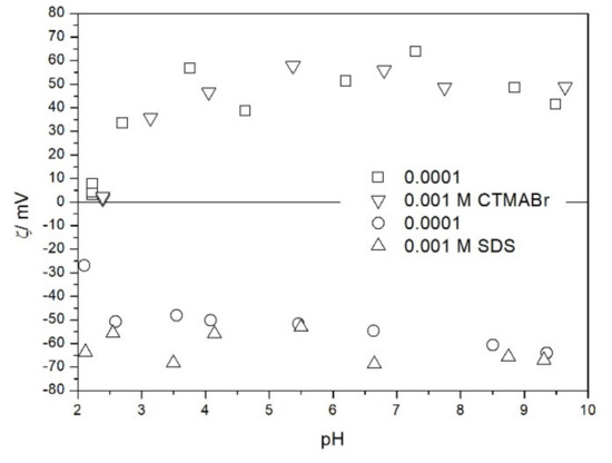 We also studied the zeta potentials of TeO2 in the presence of ionic surfactants (Figure 8). The zeta potential in the presence of sodium dodecylsulfate SDS was about −60 mV and it was pH-independent. Also the increase in SDS concentration from 10−4 to 10−3 M had rather insignificant effect on the zeta potential. This result is due to high affinity of SDS to the surface combined with low specific surface area of the powder. Thus, the uptake of SDS anions by TeO2 surface reaches a maximum value at relatively low SDS concentration, and the negative charge of pre-adsorbed SDS anions prevents from further uptake of these anions. The zeta potential in the presence of cetyltrimethlyammonium bromide CTMABr was about +50 mV and it was pH-independent at pH > 3. Also the increase in CTMABr concentration from 10−4 to 10−3 M had rather insignificant effect on the zeta potential. Lower absolute value of zeta potential in the presence of CTMABr as compared with SDS may be due to the fact that the negative charge of adsorbed SDS anions and the negative pristine surface charge of TeO2 add up, while the positive charge of adsorbed CTMA cations is partially balanced out by the negative pristine surface charge of TeO2. Unlike with SDS, the adsorption of CTMA cations on TeO2 is affected by the electrostatics. At pH about 2.5 TeO2 is not charged, and the effect of CTMABr on its zeta potential is insignificant. CTMABr adsorbs on the negatively charged surface, but not on electroneutral or positively charged surface. In this respect TeO2 is very different from metal oxides, which strongly adsorb CTMA cations even at pH below their pristine PZC [16].