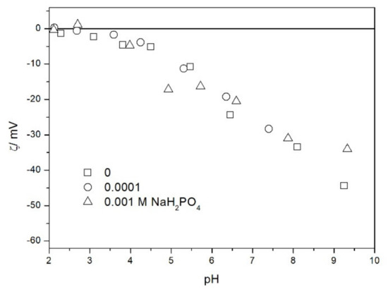 We also studied the zeta potentials of TeO2 in the presence of phosphate (Figure 9). The zeta potential was practically unaffected by the presence of phosphate (up to 10−3 M). In this respect TeO2 is very different from metal oxides, which strongly adsorb phosphate and other multivalent inorganic anions, and their IEP is shifted to low pH even at low concentrations of these anions [17]. In contrast with metal oxides, the effect of inorganic anions on the zeta potential of silica was seldom studied. A few results compiled in ref. [18] show that the uptake of inorganic anions by silica is low, and their effect on its zeta potential is rather insignificant.