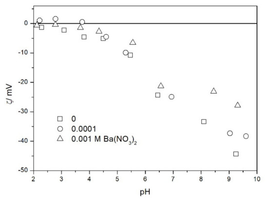 We also studied the zeta potentials of TeO2 in the presence of barium (Figure 10). The IEP was practically unaffected by the presence of barium (up to 10−3 M). In this respect TeO2 is very different from metal oxides, which strongly adsorb barium and other multivalent inorganic cations, and their IEP is shifted to high pH even at low concentrations of these cations [19,20]. Depression of negative zeta potentials in 10−3 M Ba(NO3)2 at pH > 7 with respect to 10−3 M NaCl can be interpreted as the effect of increase in the ionic strength and it does not unequivocally indicate specific adsorption of Ba. In other words we do not need to invoke specific adsorption to explain the difference between Ba(NO3)2 (Figure 10) and NaH2PO4 (Figure 9): in view of divalent counterion (Figure 10) and monovalent counterion (Figure 9), the difference may be due to pure electrostatics. Moreover, NaH2PO4 is a weak electrolyte.