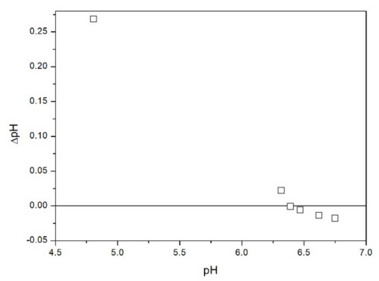 Salt titration of dispersion of 10 g of TeO2 in 50 mL of water was carried out at 25 °C in nitrogen atmosphere. 50 μL portions of 3 M KCl were added to pre-equilibrated dispersion, and the change in the pH induced by salt addition was recorded. When the pH increased, 0.1 or 0.005 M KOH was added to further increase the pH. When the pH decreased, 0.01 M HCl was added to further decrease the pH. After each addition of salt, acid or base the dispersion was equilibrated. The initial dispersion was stirred in a stream of nitrogen for about 1 h before the titration to remove any trace of CO2 and O2 from the dispersion, and an overpressure prevented the flow of external air into the reactor. The salt titration relies on very small changes in pH (cf. Figure 11) so any trace of CO2 in the reactor may affect the results, especially at pH about 7. In this respect the salt titration is very different from electrophoresis where 0.01 pH unit or so is immaterial (cf. the sizes of the symbols in Figure 2, Figure 3, Figure 4, Figure 5, Figure 6, Figure 7, Figure 8, Figure 9 and Figure 10 which are about 0.1 pH unit).
