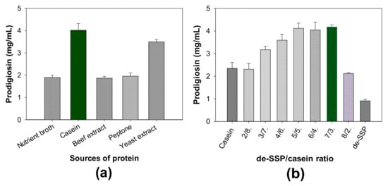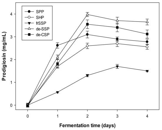 PG production by fermentation has been reported in numerous studies; however, almost all of them used commercial nutrient mediums [10,11,12,13,14,15] or agricultural products [6,16,17,18,19,20] for fermentation. Different from previous studies, we used a designed medium containing the low-cost material de-SSP for the cost-effective biosynthesis of PG. In addition, de-SSP represented a newly found potential source for cost-effective PG production by S. marcescens in this study.
