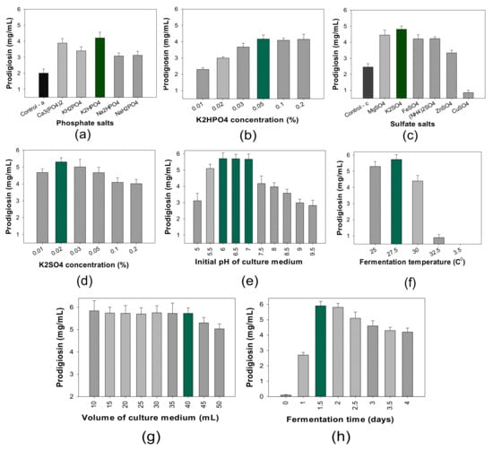 A suitable composition of phosphate and sulfate salts has shown enhanced PG productivity by S. marcescens strains [31,32,33]. For more effective PG production in this study, various kinds of phosphate and sulfate salts were utilized for fermentation (Figure 2). The results indicated that, compared to other phosphate salts, the addition of K2HPO4 salt into the culture medium resulted in the highest PG synthesis by the TNU01 strain (Figure 3a). A control group (no addition of phosphate salt) was also investigated for comparison, and this control group showed the lowest PG yield compared to all experimental groups. In the next experiment (Figure 3b), the addition of K2HPO4 at a concentration of 0.05% was found to be the most effective on PG production by S. marcescens TNU01. Thus, K2HPO4 salt at its optimal concentration of 0.05% was further combined with various kinds of sulfate salts to screen the most effective sulfate salt on PG biosynthesis. Among the various examined sulfate salts, K2SO4 was found to be the best source of sulfate salt (Figure 3c) when added to the medium at a low concentration of 0.02% (Figure 3d). This was the first study to report the use of K2SO4 as a potential sulfate salt source for the significant enhancement of PG production by S. marcescens.