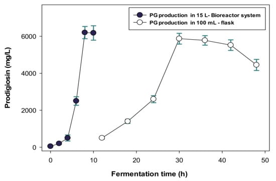 To scale up the PG biosynthesis, a bioreactor system with a full volume of 15 L was used for fermentation. The biosynthesis of PG on a small-scale in a 100 mL flask was also conducted for comparison. As shown in Figure 4, S. marcescens TNU01 produced the highest PG yield of 6200 mg/L after eight hours of fermentation, at which time the color of the culture broth appeared the reddest (Figure S1 presented in the Supplementary Materials). In contrast, this bacterium produced a lower yield of PG (5870 mg/L) over much longer time courses of fermentation (30 h) in a 100 mL flask.