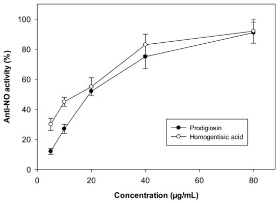 The anti-NO activity of prodigiosin (PG) produced via fermentation in this study. The error bars in the figures are standard errors (SE).