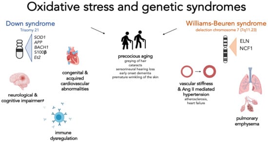Oxidative stress and genetic syndrome, a focus on Down and Williams-Beuren syndromes. This figure summarizes for each syndrome the genes involved in the regulation of oxidative stress and the clinical manifestations that have been attributed to the effect of excessive oxidative stress. Interestingly, for both syndromes, a possible role of the indicated genes in directly or indirectly causing signs of premature ageing has been hypothesized. Down syndrome—Cognitive and neurological disorders: represent one of the main features of these patients: the overexpression of SOD1 and APP is associated with mitochondrial alterations, increased oxidative damage on neuronal cells, and early formation of senile plaques. Elevated expression of Ets-2 is associated with increased neuronal apoptosis. An abnormal production of BACH1 increases the risk of neurodegeneration. S100β, when overexpressed, leads to increased production of ROS. Immune dysregulation: SOD1 plays a role in modifying the activity and response of T cells; Congenital and acquired cardiovascular abnormalities: although no specific gene has been identified, it seems that increased oxidative stress and mitochondrial dysfunction are associated with increased development of these complications. Williams-Beuren syndrome—vascular stiffness and Ang-II-mediated hypertension: Elastin haploinsufficiency is associated with the presence of increased vessel thickness and stiffness resulting in reduced lumen and increased pressure. These changes result in a physiological increase in angiotensin II and activation of NADPH. The subsequent level of oxidative stress and the response of the cell to the effect of angiotensin II depend on the number of copies of the NCF1 gene involved by the deletion; Pulmonary emphysema: Elastin haploinsufficiency predispose subjects to premature development of pulmonary emphysema.