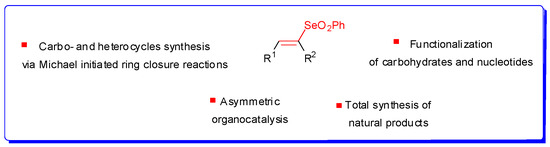 Selenium chemistry has rapidly grown over the past years and nowadays selenium reagents are recognized tools in the chemo-, regio-, and stereoselective synthesis of molecules containing selenium or not [1,2,3]. In fact, selenium functionalities can be easily reduced, eliminated or transformed into other functional groups with high stereocontrol. In this field, over the past decade, the chemistry of vinyl selenones has been the object of renewed interest, leading to the development of diverse and powerful methods with applications in challenging fields of organic synthesis, such as the enantioselective synthesis and the total synthesis of natural products. The chemistry of these hexavalent, tetra-coordinated selenium compounds shows interesting analogies with that of the corresponding vinyl sulfones. Both contain an electron-withdrawing group that stabilizes vicinal carbanions and activates the double bond to conjugate nucleophilic attack, but the weak C-Se bond donates to the phenylselenonyl moiety, a better leaving group character for further substitution or elimination reactions. In this review, recent applications of vinyl selenones in domino or sequential one-pot processes for the assembly of carbo- and heterocycles, the functionalization of biomolecules, and the organocatalyzed enantioselective construction of all-carbon quaternary stereocenters will be presented and discussed (Figure 1). Main advantages of such multiple-bond forming strategies are the mild and operationally simple reaction conditions, the good to excellent yields, and the high chemo-, regio-, and stereo-selectivities. Examples of use of vinyl selenones in the total synthesis of natural products will also be shown.