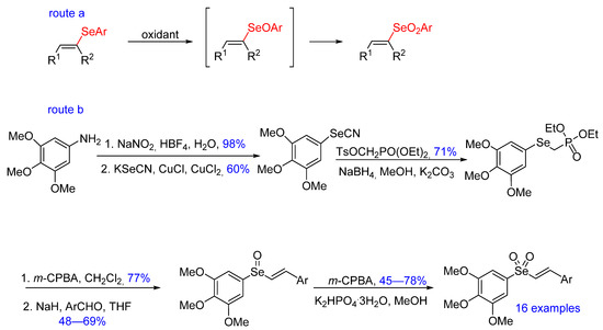Selenones are usually prepared by oxidation of the corresponding selenides [4,5]. The first oxidation of selenides to selenoxides is fast, but the decreased electron density on the selenium atom makes selenoxides less prone to the second oxygen transfer. Even if, several strong oxidants convert selenides into selenones, i.e., KMnO4 [6], peroxyacids or their salts [6,7], H2O2 in the presence of benzenseleninic acid [8], HMPA peroxo complex of molybdenum [9], Oxone® [10], and HOF·CH3CN complex [11], 3-chloroperoxybenzoic acid (m-CPBA) [12] is the reagent of choice for the oxidation of vinyl selenides (Scheme 1, route a). It is used in excess in alcoholic, ethereal or halogenated solvents. Recently, the greener Oxone® was used to generate vinyl selenones [13] in water without addition of any catalyst or co-solvent.