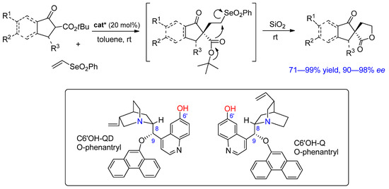 Organocatalyzed Michael-initiated cyclizations for the enantioselective synthesis of polycyclic compounds, such as spirolactones [49] and β-aminoesters [50] with a tetrahydroindeno[1,2-b]pyrrole core, were also developed by the same authors. In these reactions, the selenonyl group also acts as a traceless agent able to activate and control the addition step. The key step of both synthetic protocols is the conjugate addition of a cyclic tert-butyl-β-ketoester to vinyl phenyl selenone, catalyzed by a O-9-phenantryl C6′-OH quinidine or quinine-derivative, that generates highly enantioenriched Michael adducts. In the first process, the addition of silica gel after the Michael reaction, promoted the ring closure through nucleophilic displacement of the SeO2Ph by the carbonyl ester. The presence of the tert-butyl residue, which can be easily removed by the free silanol groups of the silica, was essential for an efficient cyclization. The use of pseudo-enantiomeric catalysts O-phenantryl C6′OH-QD and C6′OH-Q, having opposite configurations at C8 and C9, provided spirolactones with comparable yields and enantiomeric excesses, but opposite enantioselectivity (Scheme 18).