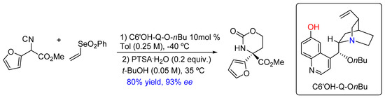 Interestingly, a catalyst loading of only 5 mol% did not compromise the chemical and optical yields, albeit longer reaction times were needed. In more recent papers, the trifluoroacetic acid deprotection of the racemic β-amino esters obtained by a modified protocol that employs Na2CO3 in place of the chiral catalyst, gave access to β-amino acids. These compounds were resolved by amylase or zwitterionic cinchona alkaloid-based chiral stationary phases [51,52]. In 2013 Zhu and coworkers developed the asymmetric conjugate addition of 2-aryl-2-isocyanoacetates to vinyl phenyl selenone with the C6′-OH quinine-derived catalyst (C6’OH-Q-OnBu), bearing a n-butoxy group reported in Scheme 20 [53]. In the same scheme, a possible transition state consistent with the observed enantioselectivity was also reported. The presence of electron-donating or electron-withdrawing groups at ortho, meta, or para position of the α-aryl substituent as well as the presence of heteroaromatic rings were well tolerated. In all the cases, the products were obtained in good to excellent yields and enantiomeric excesses ≥74%.