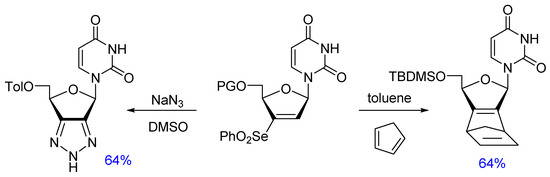 Vinyl selenone-modified nucleosides or monosaccharides were deeply investigated as substrates for the diversity-oriented synthesis (DOS) of enantiopure, structurally and functionally complex molecular scaffolds. In early reports, Chattopadhyaya et al. [36,37,38,39] described the synthesis of 2′,3′-modified uridine derivatives as part of a drug discovery program concerning new types of selective inhibitors of the HIV-reverse-transcriptase (Scheme 12).