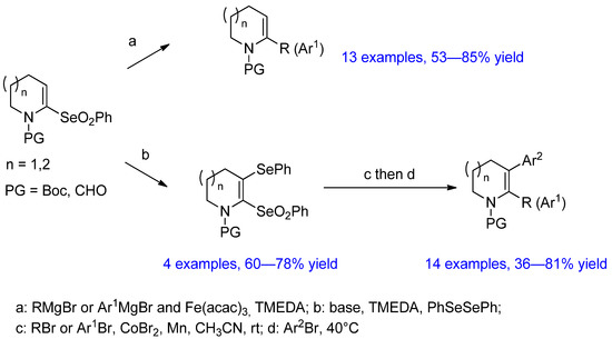 The investigation of vinyl selenones as electrophiles in transition-metal catalyzed cross-coupling reactions has been explored by Beng in 2015. Scheme 32 shows the iron catalyzed α-carbofunctionalization of piperidine and azepane ene-formamides or carbamates with alkenyl, aryl, heteroaryl, and allyl Grignard reagents (route a).
