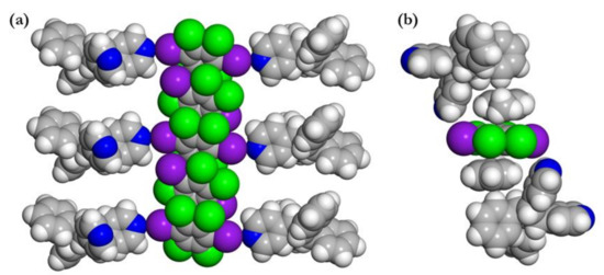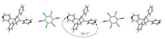 These linear chains interact with the nearest neighboring chains by both Cl⋯π and offset π⋯π stacking interactions (Figure 2). In particular, all of the chlorine atoms on C6I2Cl4 are found to interact with two pyridyl rings (Cl⋯π 3.31 and 3.70 Å) and two phenyl rings (Cl⋯π 3.53 and 3.75 Å) measured from the chlorine atom to the centroid of the aromatic ring [12]. These Cl⋯π interactions are found to occur between C6I2Cl4 and ht-PP within the obtuse angles of the aromatic rings. In contrast, the offset π⋯π stacking interactions (π⋯π 4.51 Å) occur between neighboring phenyl groups and are located within the acute bond angles around the cyclobutane rings.
