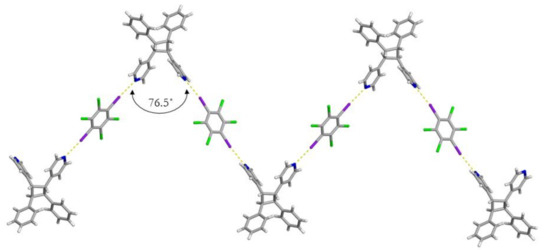 X-ray structure of 3(C6I2Cl4)·2(hh-PP)·4(toluene) illustrating the I⋯N halogen bonds that result in the observed zigzag topology due to the 1,2-position of the 4-pyridyl groups around the cyclobutane ring. Grey ball-C atom, white ball-H atom; green ball-Cl atom; purple ball-I atom; blue ball-N atom.