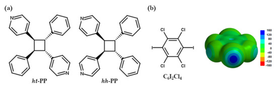 Components of the halogen-bonded networks: (a) halogen-bond acceptors ht-PP and hh-PP with indicated regiochemistry around the cyclobutane-based nodes and (b) the halogen-bond donor C6I2Cl4 with molecular electrostatic potential plot.
