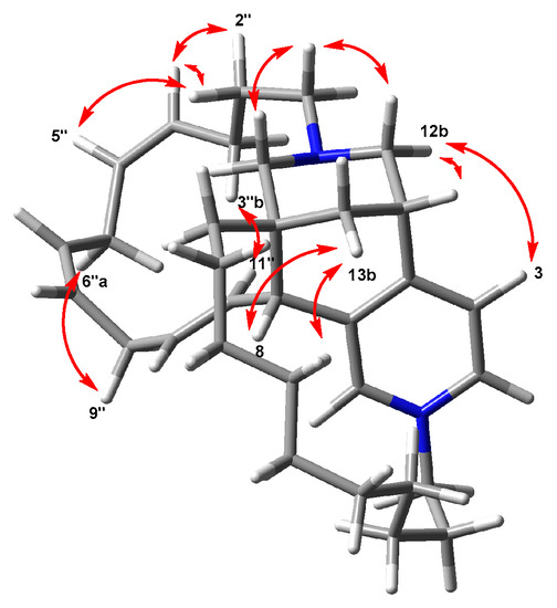 The structure of densazalin, containing three chiral centers and three double bonds, was configured by analysis of the NOESY spectrum and the proton coupling constants. NOE correlations of H-1/H-12b and H-1/H-13 established that H-1 is in an equatorial position of the tetradehydropyran ring, and the perpendicular placement of the pyridinium ring to the tetrahydropyran ring was supported by the NOE correlations between H-3 and H-12b. Based on this configuration, the NOE cross-peaks of H-6/H-8 and H-8/H-13b led to the configuration of C-8 and C-9 as R* and R* forms, respectively (Figure 2). This configuration allowed us to observe the NOE between H-11″ and H-3″b at a long distance. Moreover, the abnormal upfield shift of H-4’a was caused by the location of this proton above the pyridinium ring. The geometries of the double bonds in chain A were assigned as 4Z, 6Z, and 10E by the NOE correlations of H-2″/H-5″, H-6″/H-9″ and the large coupling constant (J = 15.9 Hz) between H-10″ and H-11″. The absolute stereochemistry of 1 was elucidated by the comparison of the quantum chemically calculated electronic circular dichroism (ECD) with the measured spectrum, as shown in Figure 3. After generating the input structure of 1 as determined by the NOE correlation studies, a conformational search was performed using molecular mechanics with MMFF, and eight conformers with low energies were determined within a 12 kJ/mol threshold. Geometry optimization of each conformer was performed at the B3LYP/6-31G(d) level, and then their single-point energies were calculated at the B3LYP/6-311G+(2d,p) level to obtain their respective Boltzmann populations at 298 K (Supplementary Materials Table S1). The calculations of the ECD spectra for all populated conformers were performed at the B3LYP/6-31G(d,p) level [31].