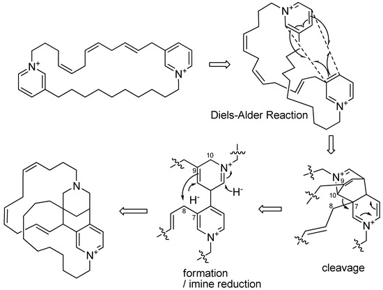 A plausible biosynthesis of 1 would be similar to that suggested for the formation of the halicyclamine structure from a 1,3-dialkaylpyridinium [15] (Figure 4): the two pyridiniums rings formed a xestocyclamine skeleton by Diels–Alder cyclization [32], and subsequent cleavage of the C-7/C-10 bond, formation of the C-8/C-9 bond, and reduction lead to a diazatricyclic ring.