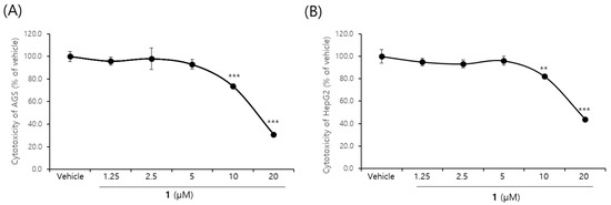 Dose–response curves of 1 on AGS (A) and HepG2 (B) carcinoma cell lines. Cells were cultured with 0–20 μM of 1 for 24 h. Each value is expressed as the means ± SD of triplicate determinations. ** p < 0.01, *** p < 0.001 versus vehicle group.