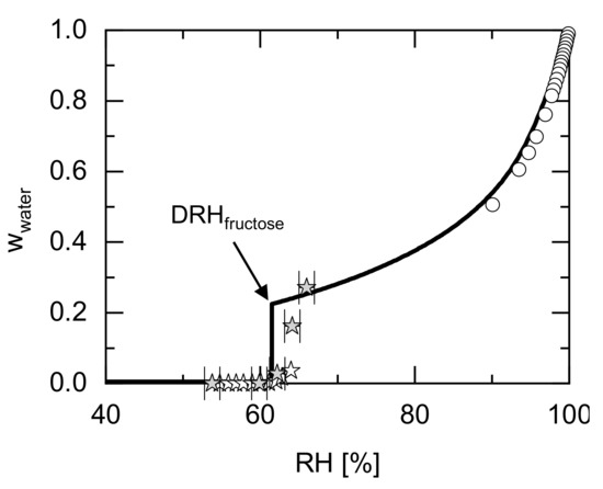 The sorption measurements [14,45] shown in Figure 2 indicate that the water sorption below 61% RH is almost zero and thus fructose crystals are stable below this RH. Above 61% RH, a water-sorption increase is observed. The experimental mass fraction of water slightly above DRH steadily increases from 0 to 0.23, while the water sorption is expected to jump abruptly to the water mass fraction of 0.22 according to thermodynamic phase equilibrium conditions. However, due to kinetic inhibitions, this abrupt jump to equilibrium water mass fractions is not observed in the measurements. Therefore, the prediction might indicate that the measured data points between 62 and 64% RH were not in thermodynamic equilibrium yet. Only the measured water sorption at 66% RH (highest investigated RH) seems to have reached thermodynamic equilibrium.
