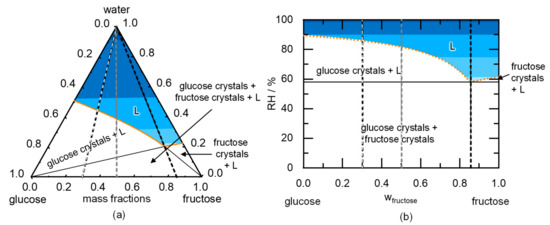 Figure 3b shows the phase behavior of a glucose/fructose crystal mixture upon exposure to RH. Analogous to the solubility line in Figure 3a, the deliquescence line in Figure 3b separates the region of a thermodynamically stable unsaturated solution above the line from the crystal phase below the solubility/deliquescence line. The glucose and fructose deliquescence lines start on the left and the right axis (predicted DRHglucose and DRHfructose), respectively, and both decrease in the mixture. DRHmix is obtained at the intersection of the deliquescence lines (with the eutonic or eutectic composition [14]). The water activity of the saturated liquid (composition of this liquid shown in Figure 3a) is fix and exactly corresponds to the DRHmix shown in Figure 3b (see Equation (4)).