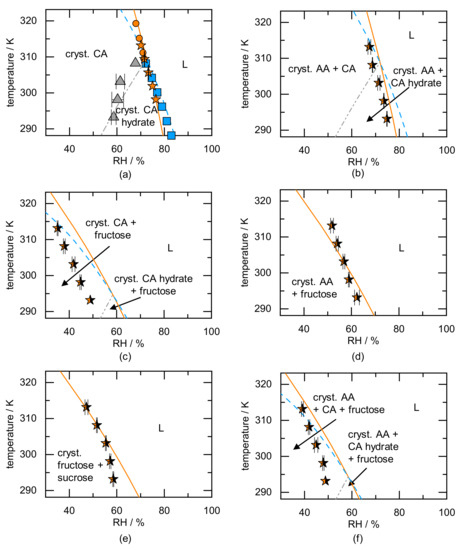 The temperature dependence of deliquescence for the AA/CA/fructose ternary crystal mixture is finally shown in Figure 5f. The literature data show that the crystal mixture deliquesce above 48.8% at 293.15 K [44]. This leads to the fact that, similar to the CA/fructose crystal mixture, hydrate does not occur (hydrate formation of CA hydrate above 59% RH [33]). The predicted DRH of the ternary mixture is higher than the one obtained from Reference [44] (overall ARD 11%). Particularly considering that all lines in Figure 5 were full predictions using solubility data of each individual component in water only, the predictions seem valuable for estimating stability regions. Thus, the RH and temperature limits for stable food or pharmaceutical ingredients (also in crystal mixtures) can be predicted, and time-consuming experiments (vapor-sorption measurements or equilibrium water activity measurements) can be prevented. The predicted phase diagrams can be used to determine which component is responsible for the low DRHmix in case of crystal mixtures, and the outcome of the deliquescence (complete dissolution of either of the components) can be predicted as a function of the crystal mixture composition.
