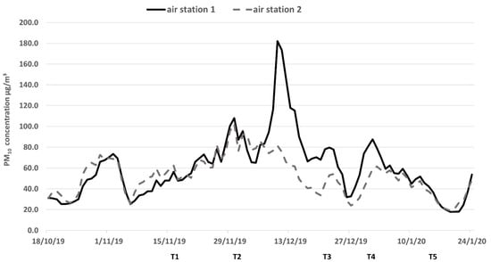 Average particulate matter (PM10) concentrations measured by air quality measuring stations near Bulga (air station 1, solid line) and Singleton (air station 2, dashed line) with sampling time points T1 to T5 approximately marked on the time series.