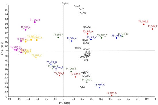 Principal components PC-1 and PC-2 scores and loadings biplot of phenolic glycosides in Chardonnay (CHA; triangles) and Shiraz (SHZ; circles) grape berries from all blocks sampled at five time points (T1: purple; T2: yellow; T3: blue; T4: green; T5: red). All values (ng/berry) are means of three field replicates (n = 3) and expressed as syringol gentiobioside equivalents per berry. Gu = guaiacol; Cr = cresol; Ph = phenol; Sy = syringol; MGu = 4-methylguaiacol; MSy = 4-methylsyringol; MG = monoglucosides; GG = gentiobiosides; PG = pentosylglucosides; RG = rutinoside.
