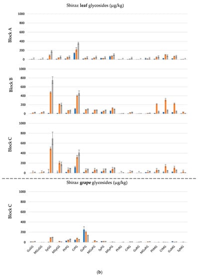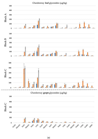 For co-located Chardonnay and Shiraz samples from blocks A and C, the glycoside concentrations in the leaf samples were much higher than those in the grape berry samples, in agreement with results reported previously [26]. This was likely due to the larger surface area of the leaves compared to the berries [34]. Furthermore, the relative expression of glucosyltransferase has shown to be higher in leaves than in grape berries [23,35]. MGs in leaves increased at T3 after exposure to heavy smoke, but were lower at T5. The decrease of MGs in leaves towards ripening could be due to subsequent glycosylation, forming disaccharides, or other sequestration reactions.