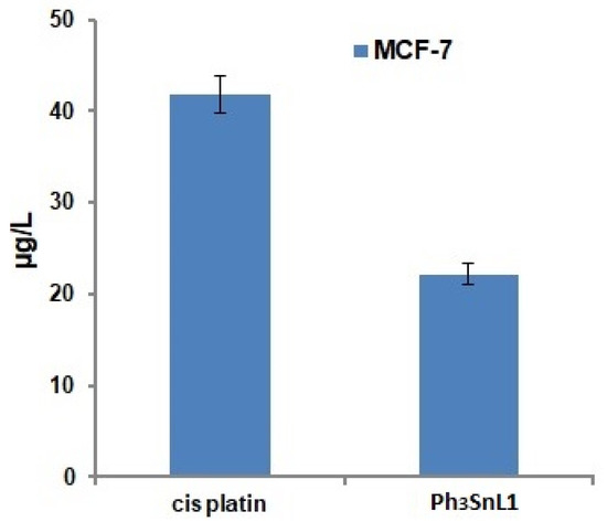 The cellular uptake features of metal-based cytotoxic drugs strongly impact the underlying anticancer performance [22]. Intracellular tin and platinum uptake in MCF-7 cells has been investigated with the aid of inductively coupled plasma mass spectrometry (ICP-MS) analysis. The treatment of cells with Ph3SnL1 and cisplatin for 24 h in concentrations corresponding to their IC50 values, as obtained by the CV assay, was performed.