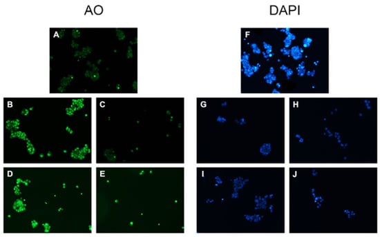 Fluorescent micrographs of MCF-7 cells. (A,F)—control (untreated cells), (B,G)—cisplatin (IC50), (C,H)—cisplatin (2 × IC50), (D,I)—Ph3SnL1 (IC50), (E,J)—Ph3SnL1 (2 × IC50); AO = acridine orange; DAPI = 4′,6-diamidino-2-phenylindole.