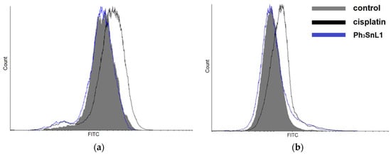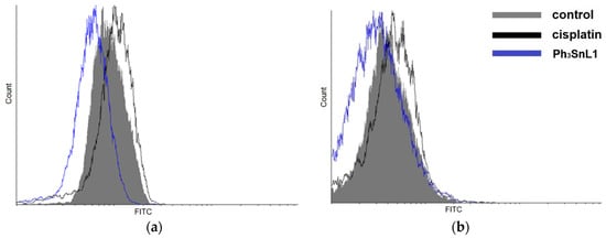 The literature data show that autophagy in cancer cells plays a dual role in cell survival and cell death [28,29]. To investigate whether the test compounds could induce autophagy, MCF-7 cells were stained with AO after treatment at IC50 concentrations of Ph3SnL1 and cisplatin for 48 h. The results obtained by flow cytometry analysis show that the autophagy process is not triggered by Ph3SnL1. On the contrary, cisplatin induces an autophagic response in MCF-7 cells at the applied concentration (Figure 3b).