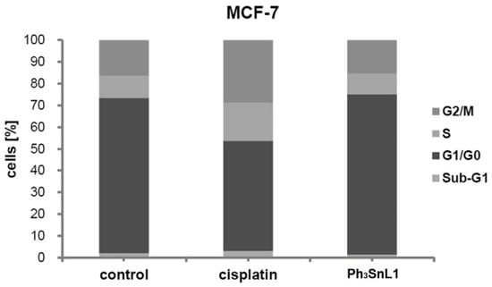 The mode of action was further investigated by analysing the effects of Ph3SnL1 and cisplatin on the cell cycle phase distribution of MCF-7 cells. This was evaluated by cytofluorimetric analysis using DAPI staining. The obtained results show that the incubation with Ph3SnL1 for 48 h does not lead to any significant changes in the cell cycle distribution (Figure 4). The analogous treatment with cisplatin also did not lead to any observable changes in the population of cells in the sub-G1 phase, while a considerable decrease was noted for the G1/G0 phase, which was coupled with an increase in the cell population in S and G2/M phases (Figure 4). The exhibited results suggest that the investigated organotin(IV) compound, Ph3SnL1, has a mode of action different to cisplatin. While cisplatin acts on DNA (among other effects), the lipophilic cationic nature of triphenyltin(IV) may guide it preferentially to mitochondria to intervene with cells’ energy metabolism.