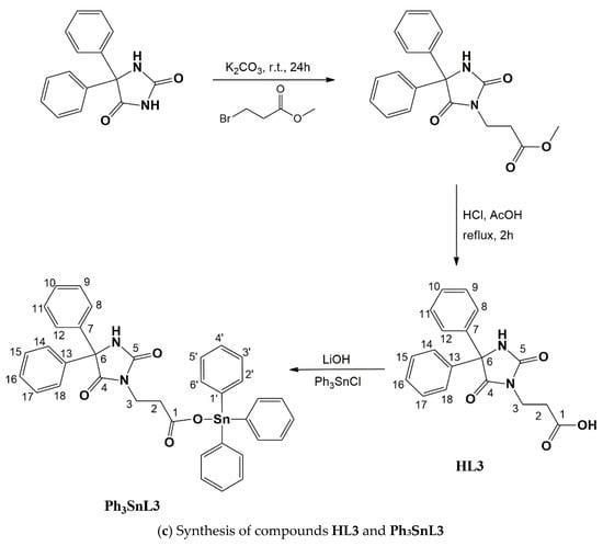 In the reaction of ligand precursors (HL1, HL2, or HL3) which were deprotonated with LiOH and reacted with equimolar amounts of Ph3SnCl, the expected compounds Ph3SnL1, Ph3SnL2 or Ph3SnL3 were obtained as white solids in good yields (Scheme 1a–c). The complexes were soluble in dimethyl-sulfoxide, chloroform, dichloromethane, and acetonitrile. They were characterized via elemental microanalysis, IR and NMR (1H, 13C, 119Sn) spectroscopy and mass spectrometry. The numbering of atoms in Scheme 1a–c was only used for NMR data assignation.