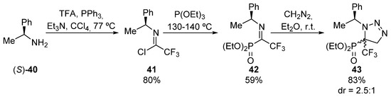 - Rassukana, Y.V.; Bezgubenko, L.V.; Stanko, O.V.; Rusanov, E.B.; Kulik, I.B.; Onys’ko, P.P. Diastereoselective cycloaddition of (S)-N-(1-phenylethylimino)trifluoropropionate and trifluoroethylphosphonate with diazomethane. Tetrahedron Asymmetry 2017, 28, 555–560. [Google Scholar] [CrossRef]