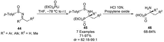 - Khan, H.A.; Ellman, J.A. Asymmetric synthesis of α-aminophosphonate esters by the addition of dialkyl phosphites to tert-butanesulfinyl imines. Synthesis 2013, 45, 3147–3150. [Google Scholar] [CrossRef]