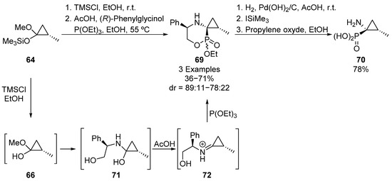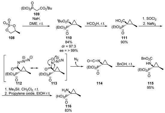 - Tesson, N.; Dorigneux, B.; Fadel, A. Synthesis of (1S,2S)- and (1R,2R)-1-amino-2-methylcyclopropane-phosphonic acids from racemic methylcyclopropanone acetal. Tetrahedron Asymmetry 2002, 13, 2267–2276. [Google Scholar] [CrossRef]