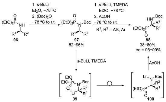 - Kuliszewska, E.; Hanbauer, M.; Hammerschmidt, F. Preparation of α-aminobenzylphosphonic acids with a stereogenic quaternary carbon atom via microscopically configurationally stable α-aminobenzyllithiums. Chem. Eur. J. 2008, 14, 8603–8614. [Google Scholar] [CrossRef] [PubMed]