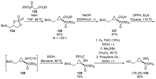 - Wąsek, K.; Kędzia, J.; Krawczyk, H. An efficient approach to the synthesis of enantiomerically pure trans-1-amino-2-(hydroxymethyl)cyclopropanephosphonic acids. Tetrahedron Asymmetry 2010, 21, 2081–2086. [Google Scholar] [CrossRef]