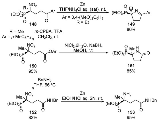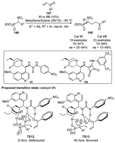 - Chen, G.Y.; Lu, Y. Highly enantioselective Michael addition of α-substituted nitrophosphonates to a vinyl sulfone. Synthesis 2013, 45, 1654–1658. [Google Scholar] [CrossRef]