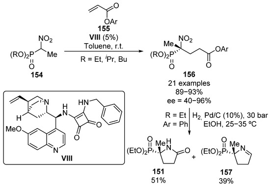 - Bera, K.; Namboothiri, I.N.N. Quinine-derived thiourea and squaramide catalyzed conjugate addition of α-nitrophosphonates to enones: Asymmetric synthesis of quaternary α-aminophosphonates. J. Org. Chem. 2015, 80, 1402–1413. [Google Scholar] [CrossRef] [PubMed]